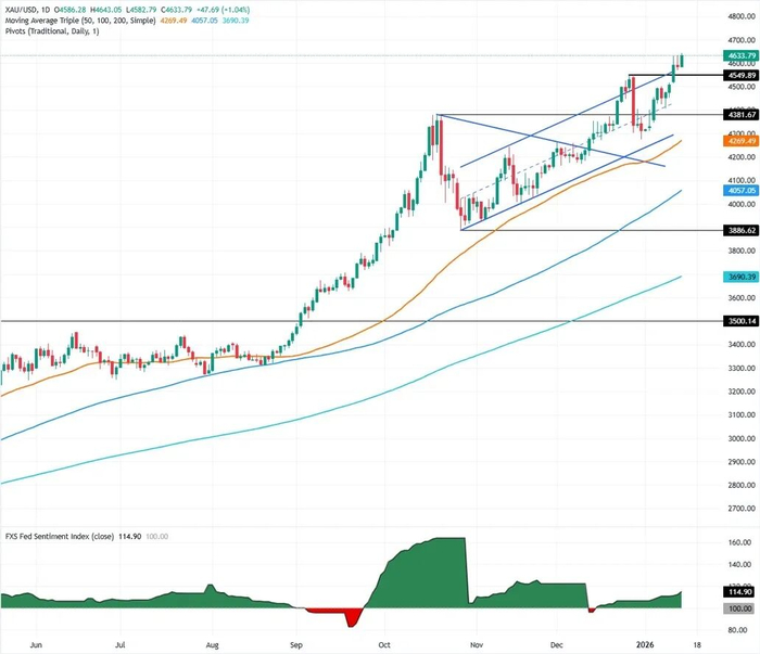 FXStreet分析师Christian Borjon Valencia指出,黄金价格上涨趋势依然完好,金价创下4643美元/盎司的历史新高。一旦买家突破4650美元/盎司,金价有望进一步上涨,并向4700美元/盎司发起冲击。然而,相对强弱指数(RSI)显示,多头似乎正在失去一些动力,目前RSI在超买区域附近保持平稳。