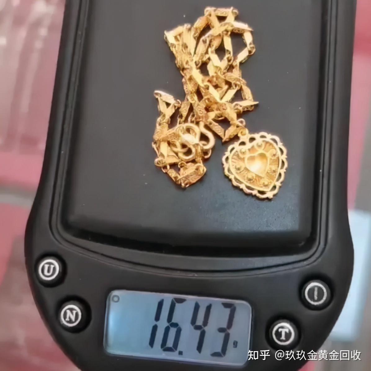 取下这位大姐的金项链,我拿在手里一看,是一款老式的心形项链,链子都是挺粗的,这一看这条金项链也是有了一定的年头,因为这样的项链花型比较粗,也就是用金子比较多,所以现在很多女士都不佩戴了,托在手里挺沉的,放到秤上一称有十六克多呢!