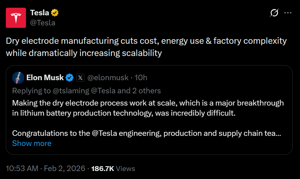 随后,特斯拉官方团队转发了这则消息,并回复称:“干电极制造工艺可降低成本、能源消耗和工厂复杂性,同时显著提高可扩展性。”